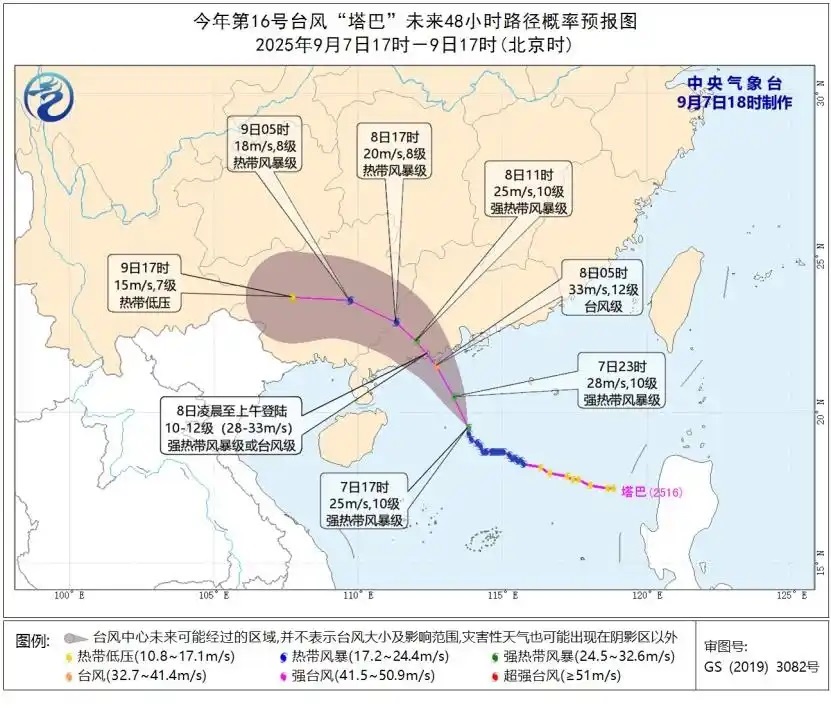 预计,“塔巴”将以每小时20公里左右的速度向北偏西方向移动,强度逐渐增强,并将于8日凌晨到上午在广东台山至电白一带沿海登陆(强热带风暴级或台风级,28-33米/秒,10-12级),登陆后强度逐渐减弱。