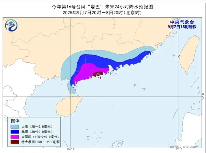 降水预报:9月7日20时至8日20时,广东中南部、广西东南部有暴雨到大暴雨,其中,广东西南部局地有特大暴雨(250~270毫米)。