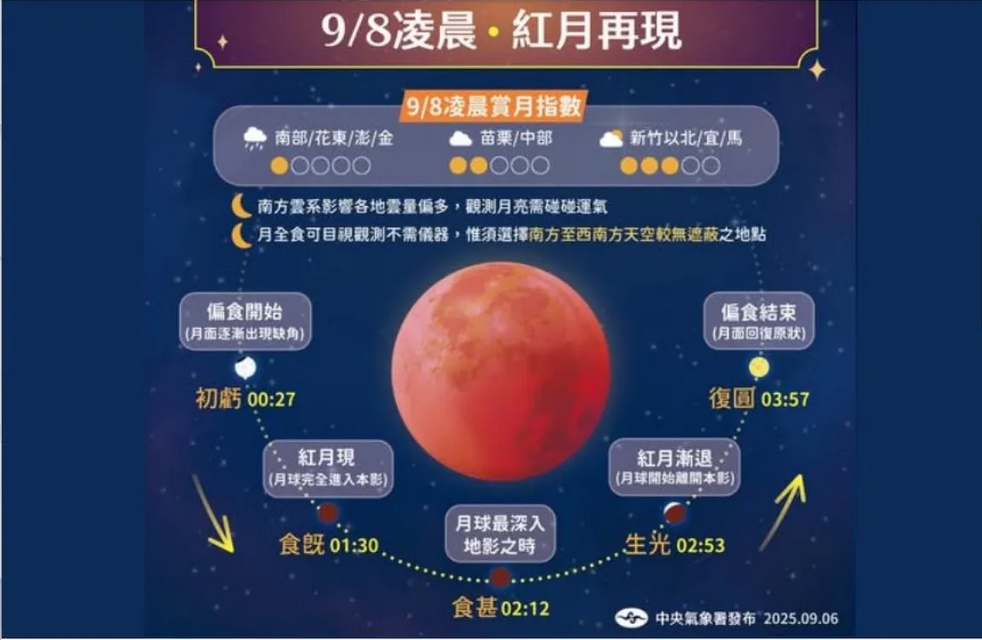 【中央社台北訊】月全食預計今(9/7)深夜至明 (9/8)凌晨登場,氣象署表示,晚間南部、台東雲層偏厚,賞月機會較低;明天持續受南方雲系北移影響,午後各地易有局部大雨;未來一週水氣逐漸減少,感受悶熱。